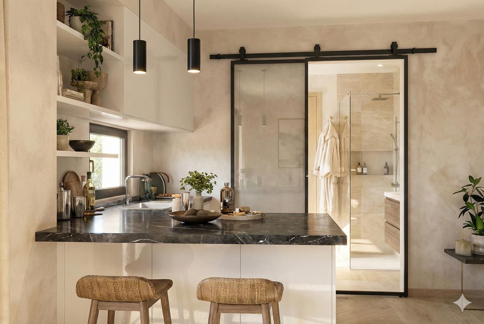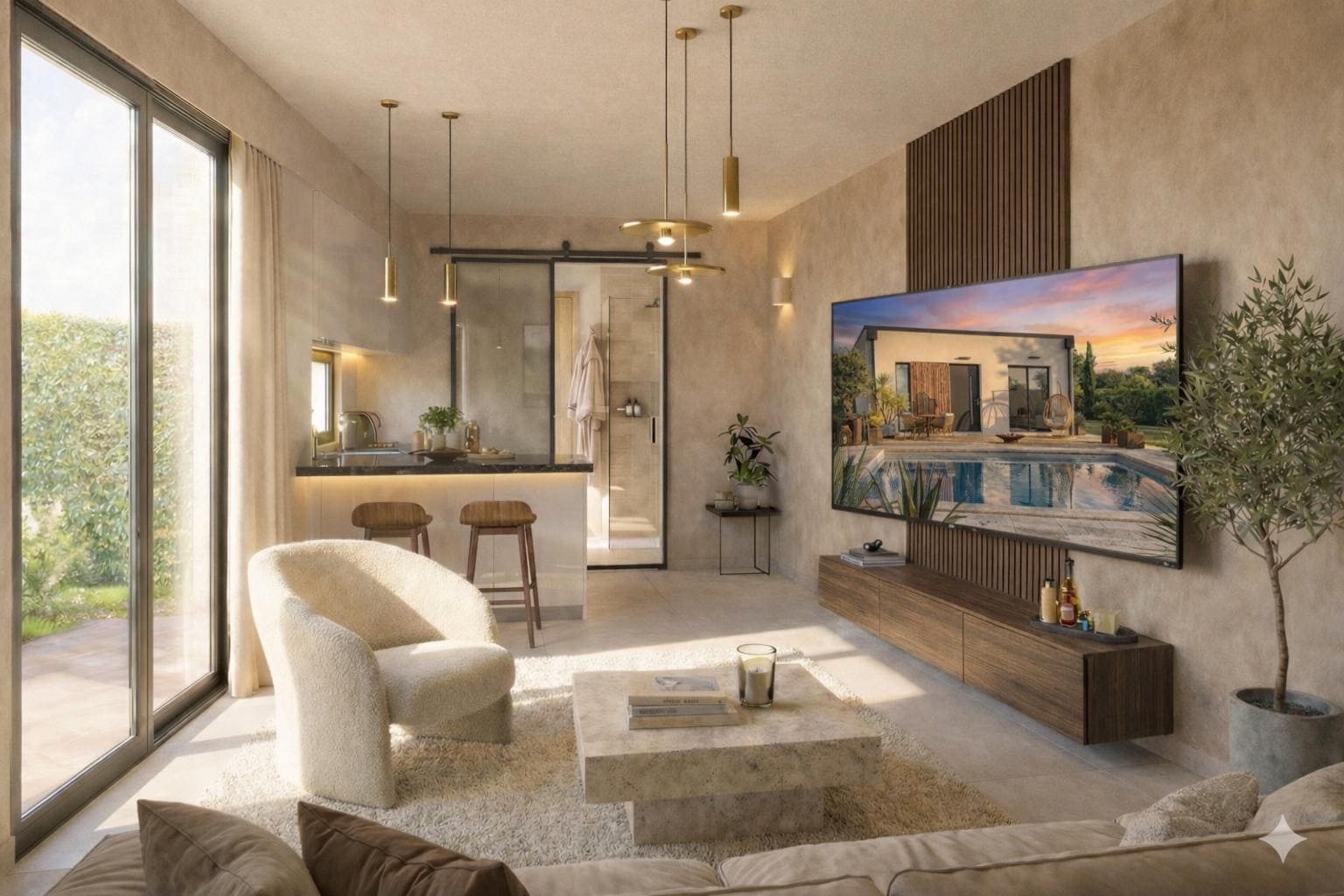 Il se compose d’un espace commun cocooning d’une superficie de 15,47 m². La cuisine ouverte reliée au salon/chambre qui offre un bel espace lumineux. Les grandes portes-fenêtres créent l’impression d’un espace plus vaste donnant sur le jarding.